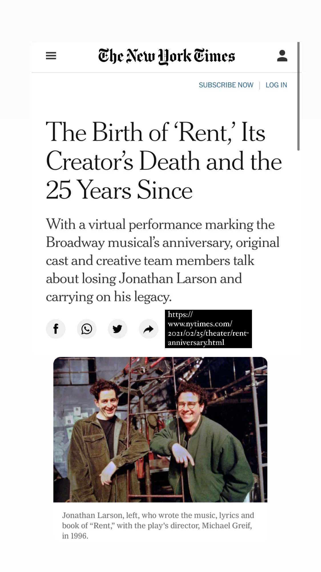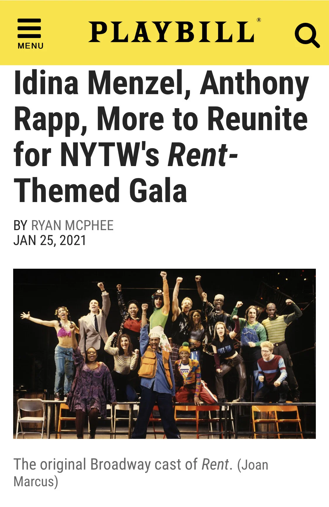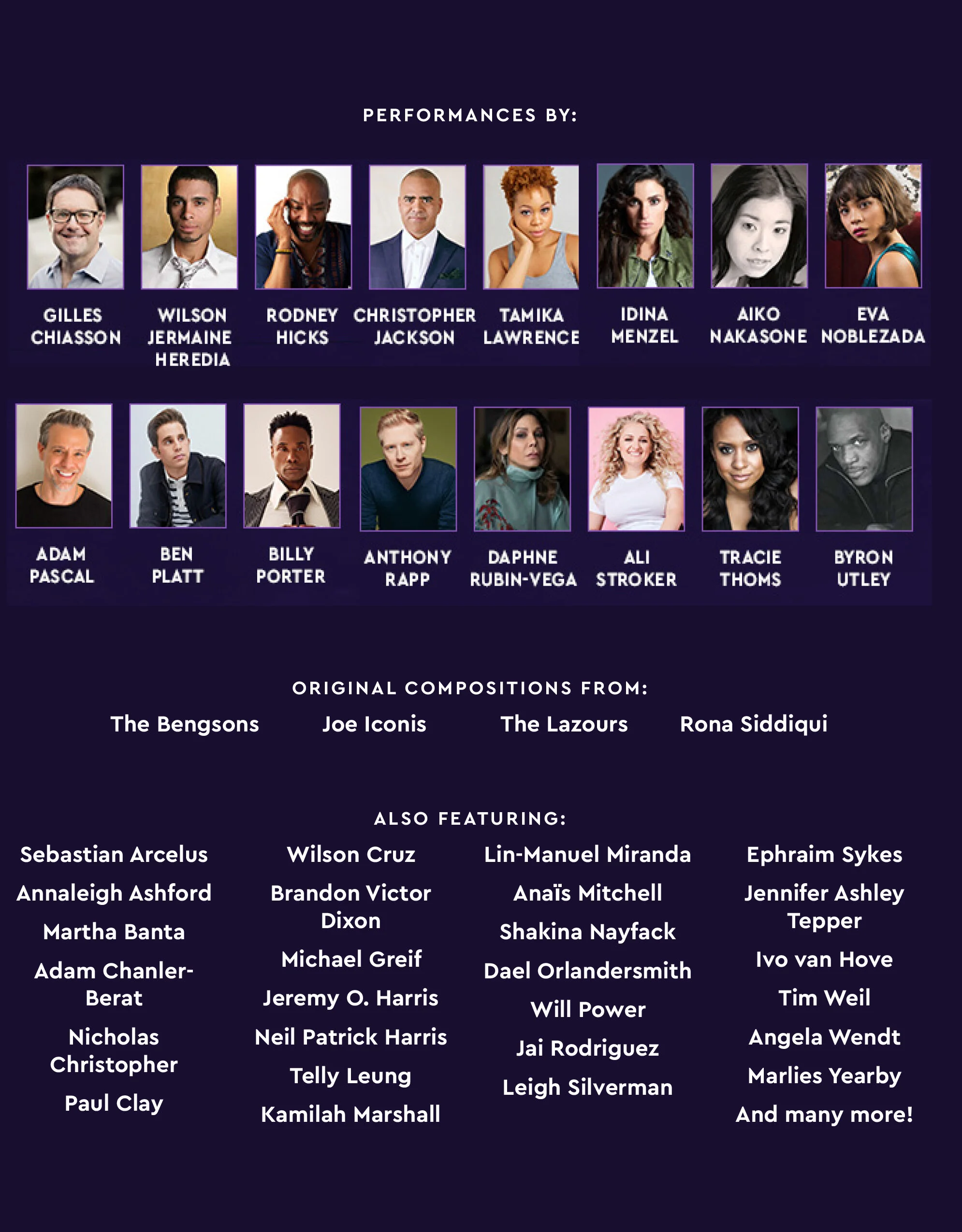 With performances by: Ben Platt, Billy Porter, Idina Menzel, Christopher Jackson, Tamika Lawrence, Eva Noblezada, Adam Pascal, Anthony Rapp, Daphne Rubin-Vega, Ali Stroker, Tracie Thoms, and the Original Broadway cast. The event was produced by New York Theatre Workshop with Musical Supervision by Stephen Oremus, Musical Direction by Will Van Dyke, Produced in association with Heredia Vision, and Video production and editing by ZANNI Productions.
