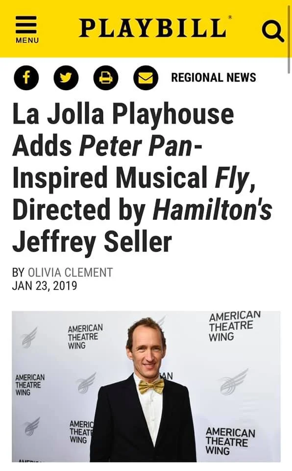 Based on the novel Peter and Wendy by J.M. Barrie, FLY was directed by Jeffrey Seller (Hamilton) Choreography by Andy Blankenbuehler (Hamilton) and Stephanie Klemons (Hamilton) FLY has a book by Rajiv Joseph, Music by Bill Sherman, and Lyrics by Kirsten Childs and Rajiv Joseph. Will Van Dyke was the musical director.