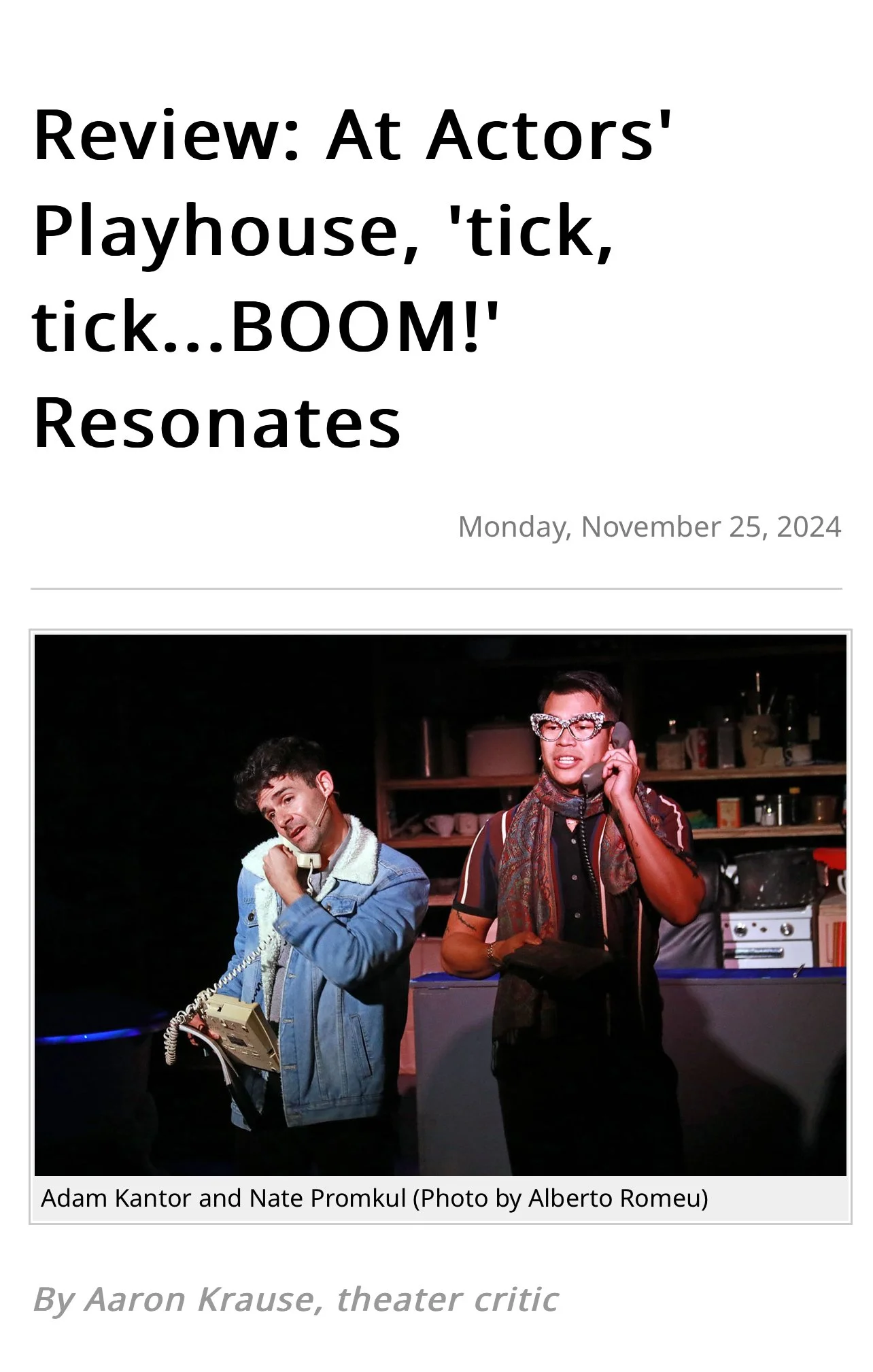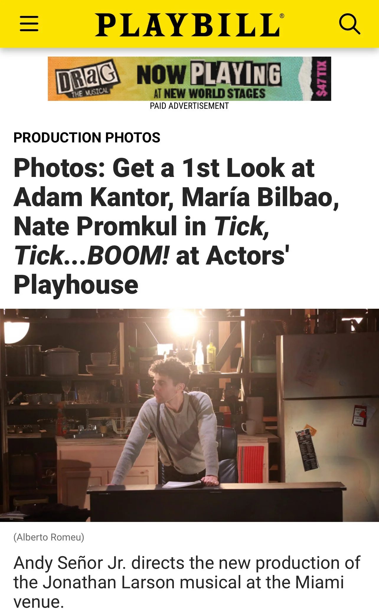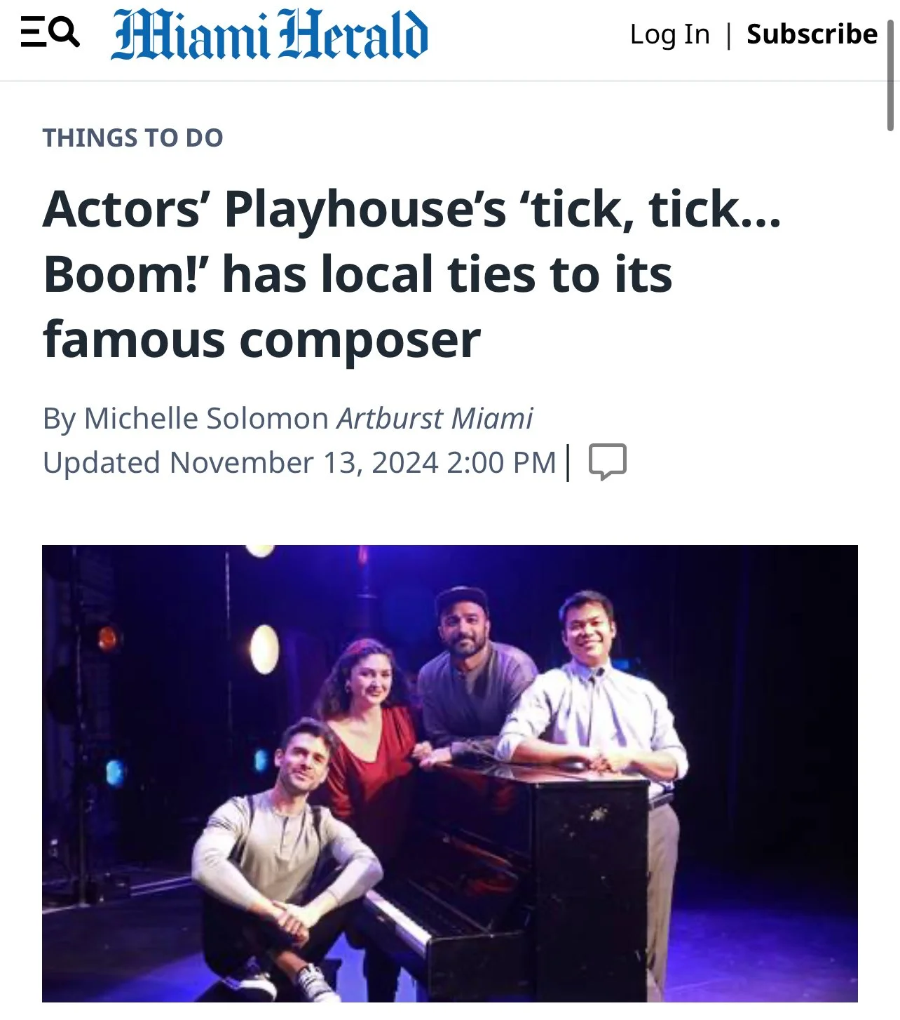 At Actors' Playhouse at the Miracle Theatre in Miami, Andy directed another acclaimed production of Tick, Tick... Boom!with a stellar cast featuring Broadway veteran Adam Kantor as Jon, María Bilbao, fresh off the Broadway revival of Sweeney Todd as Johanna, as Susan, and South Florida favorite Nate Promkul as Michael. Partnering again with Emmy Award-winning choreographer Karla Puno Garcia, the Miami production earned widespread praise for its inventive staging and emotional depth.